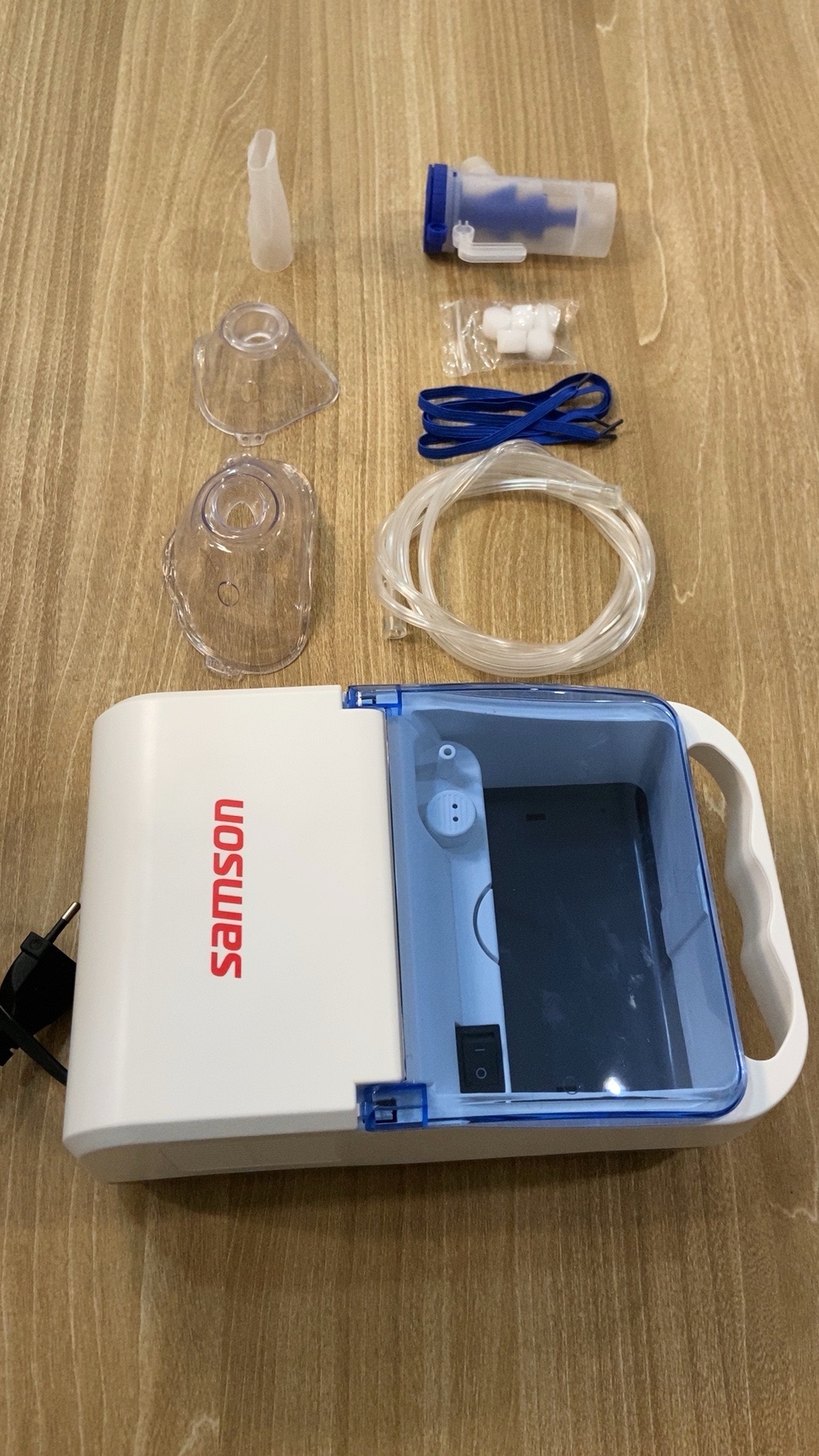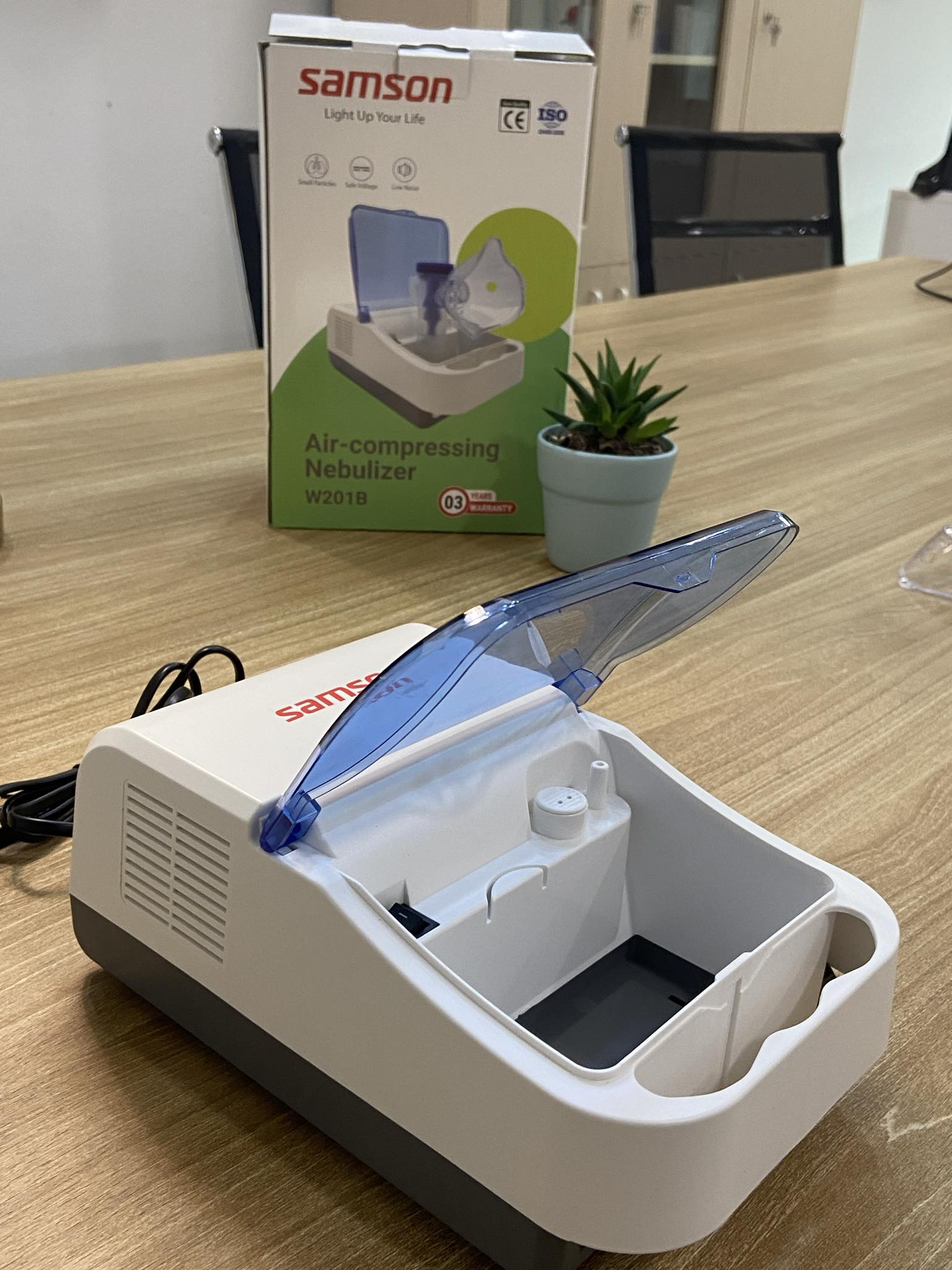 Máy xông khí dung Samson W201B sử dụng để chuyển dung dịch thuốc thành dạng sương hỗ trợ điều trị các bệnh về đường hô hấp, viêm mũi họng, hen suyễn,…